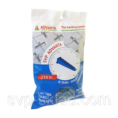 Клини СВП АДВАНТА - спеціальне будівельне пристосування, що дозволяє рівно і точно облицьовувати керамічною плиткою або ж керамогранітом будь-яку поверхню. Застосування даного пристосування забезпечить максимальне вирівнювання поверхні укладається плитки в площині, охороняючи від її перепадів на стиках і просідання. Додатковий плюс - значне підвищення продуктивності праці укладальника. Клини для укладання є складовим елементом СВП АДВАНТА.